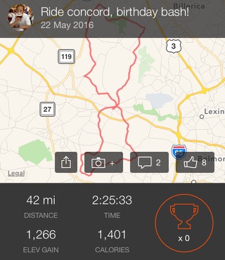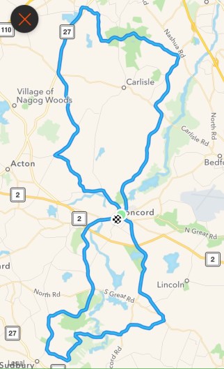 First ride out was a little treat for my birthday, a 42 mile loop around Concord that I found on Ride With GPS. Quite impressed with this site, it’s a route mapping social network/club site where users create and share rides. You can also dip in as a non-member and download guidance files for your GPS, which is exactly what I did for this unfamiliar territory.