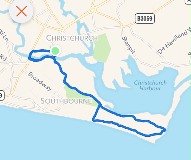 Out round Twynham school, across Tuckton bridge, round the river at wick, along the new crushed limestone path down the old tip road, and down the end of the head. From here it was up the steps to the top and back across the head. The wind here was savage today, must have been 20-25mph today. From there down to the hungry hike cafe, back along the tip road and round into Christchurch again.