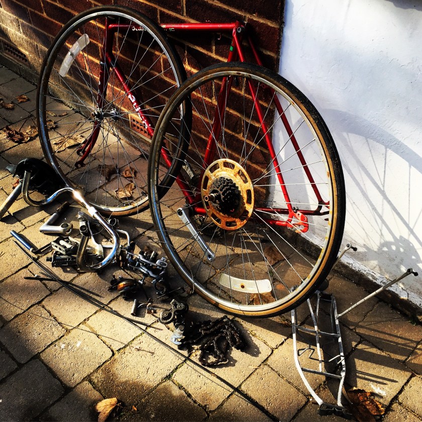 And in half an hour it looked like this. A pile of ingredients! Plans are to fix this up for a friend of mine, limited budget and a two week timescale. New tyres and tubes, bar tape, cables, and a full strip, clean, and rebuild with bearings if needed. Wheels need a bit of a straighten but we should be fine……