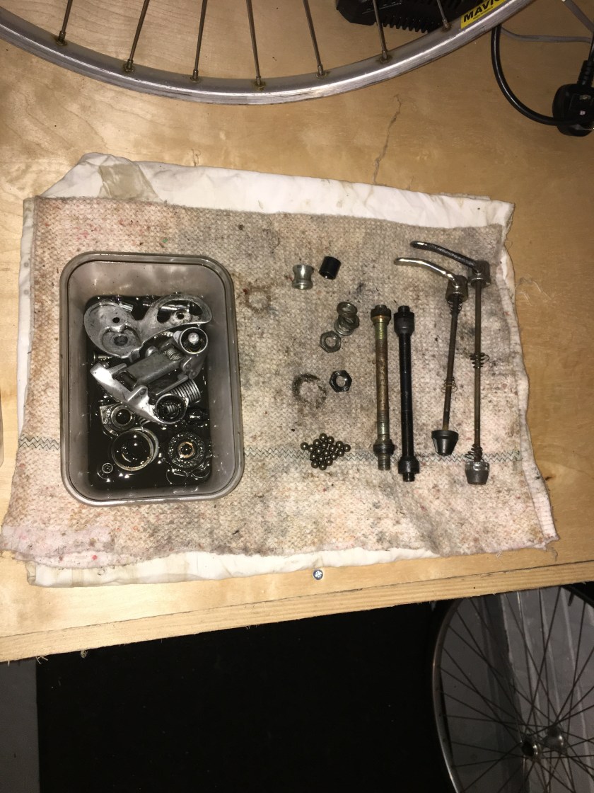 The box of derailleur parts have had a good soak and were ready for a good scrub. Bearings, axles, seals, and skewers ready to go back in the wheels.