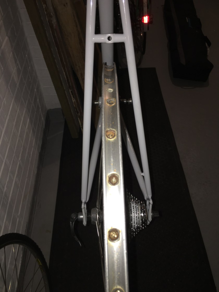 Rear wheel sits in the frame fine, original OLD was 126mm and new spacing is 130mm for the 8 speed freewheel. Had to slightly stretch out the dropouts to fit, I’m talking only slightly, but it’s in and runs sweet. I have dished the wheel to the right but as I don’t have a truing stand yet I haven’t got the ability to play with it properly. I think there will be a slight skew on the wheel and brake to start with but I’d like the wheel to settle first and then reassess it.