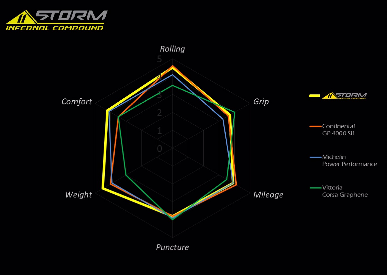 These tyres are the Hutchinson Fusion 5 Performance with the 11Storm Infernal Compound, are are their go to race ready clinchers (also available in tubeless). So apart from having one of the worlds most protracted product names, what else do I know about these tyres? Well Hutchinson are making some pretty bold claims on their website, going up against the big competitors directly in this little info graphic: