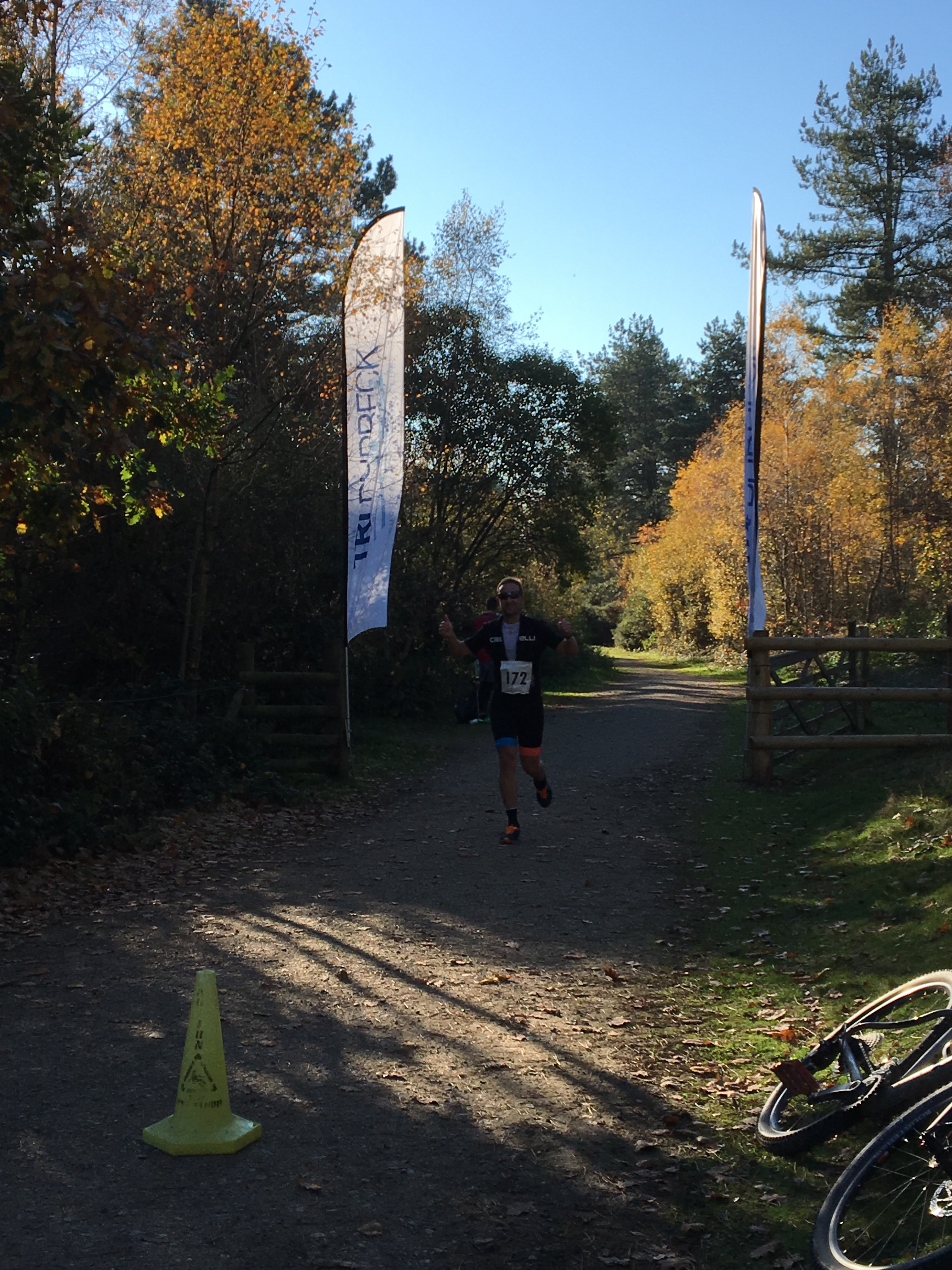 Unclipped both pedals, swung my right leg over and jumped off. Smug dismount of the day, I felt like a pro! Racked my bike, ditched helmet, swapped back into my trainers, and started the second run. This time an out and back 2 miler. Immediately my calves cramped and I couldn’t run, I had to stop and massage both legs to get them to relax, it was very painful but they freed up enough for me to shuffle on. My pace dropped to 10 minute miles and that final 2 mile run felt like an eternity, losing nearly all the places gained on the bike. Determined to finish without walking I pushed on and my legs improved slightly, 20 minutes later I crossed the line. I had complete my first duathlon, I was over the moon.