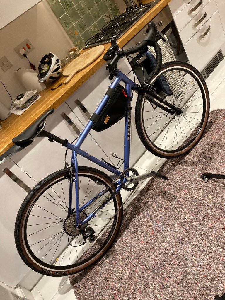 As you can see a stunning little bike! no big money spent but the perfect bike for ripping about the New Forest. The owner added the restrap frame bag as a nice little finishing touch. The bike weighs in at just over 10kg with pedals, and when you take into account that the P2 forks weight is circa 1050g, thats a very reasonable price for a 10kg bike. Most 10kg gravel bikes are £2k+. If you wanted to get the bike well under 10kg, you could shave off 600g by fitting a carbon fork for around £75 from Ebay/Aliexpress . To push it further a lightweight crankset and bottom bracket (£75 from Ebay/Aliexpress) to save a further 250g, and carbon handlebars (£50 Ebay/Aliexpress) to save another 100g, and finally a tubeless setup (£30 valves and tape) to shave a further 100g per wheel. Its possible to shave the bike to sub 9kg for another £230 total, but then where do you stop! although sub 9kg gravel bikes start to get silly money…… so maybe the comparison of £800 vs £4k+ starts to get quite attractive……..