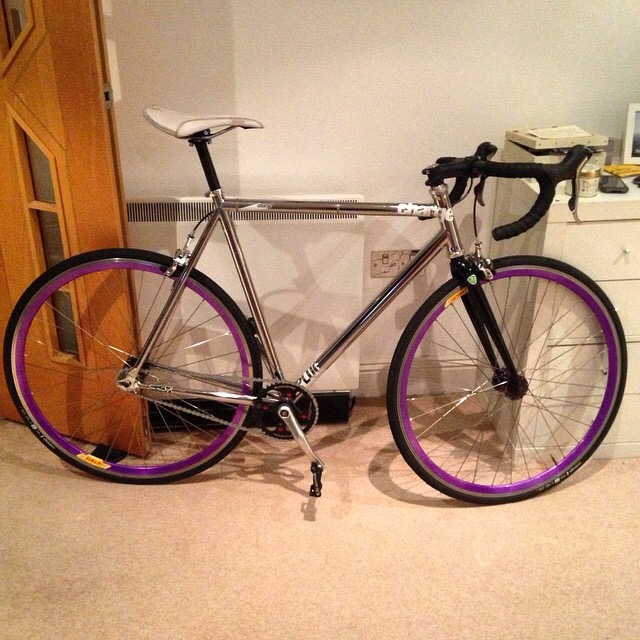 The winter hack. Bought this with a frozen seatpost, so a few days with caustic soda solution saw it removed. It also had a purple overdose, so removed as much anodising as possible! Rebuilt as Velocity deep v rims built onto Profile racing hubs, Vittoria tyres, Ultegra levers, Specialised bar and stem, Tektro brakes, Sturmey Archer Freewheel, Middleburn RS7 ISIS cranks, Blackspire chainring, Carbon seatpost, and Charge Spoon saddle.